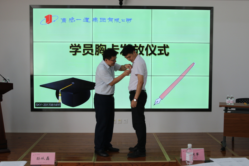 ? ? ? 培訓(xùn)前,進(jìn)行了青島一建商學(xué)院“領(lǐng)航班”第一期培訓(xùn)學(xué)員發(fā)放胸卡儀式,由集團(tuán)公司董事長、總裁、商學(xué)院院長馬樹軍親自為學(xué)員代表高玉磊佩戴胸卡,高玉磊代表本期培訓(xùn)班所有學(xué)員進(jìn)行了發(fā)言,他表示,學(xué)員們一定會(huì)珍惜集團(tuán)商學(xué)院提供的學(xué)習(xí)機(jī)會(huì),潛心求學(xué),遵規(guī)守紀(jì),共創(chuàng)集團(tuán)美好未來。